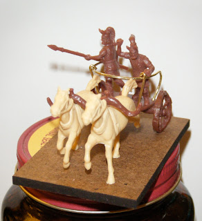 And finally, we have another chariot! I had some fun doing this guy up, with the help of Dad's new optivisor. He'll serve as the leader of the everybody-who-isn't-a-Hittite army when the Egyptians aren't around. Incidentally, that design on the chariot is actually based on a historical source, for once--a seal used by one of the kings of Mitanni.